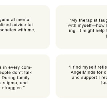 AngelMinds Connect is more than just an app; it's a vibrant community that transforms everyday challenges into opportunities for growth, celebrates the power of shared experiences, and spreads the joy of supporting one another on the journey to better mental health. So, don't just cope—connect, thrive, and empower your mind with AngelMinds Connect.